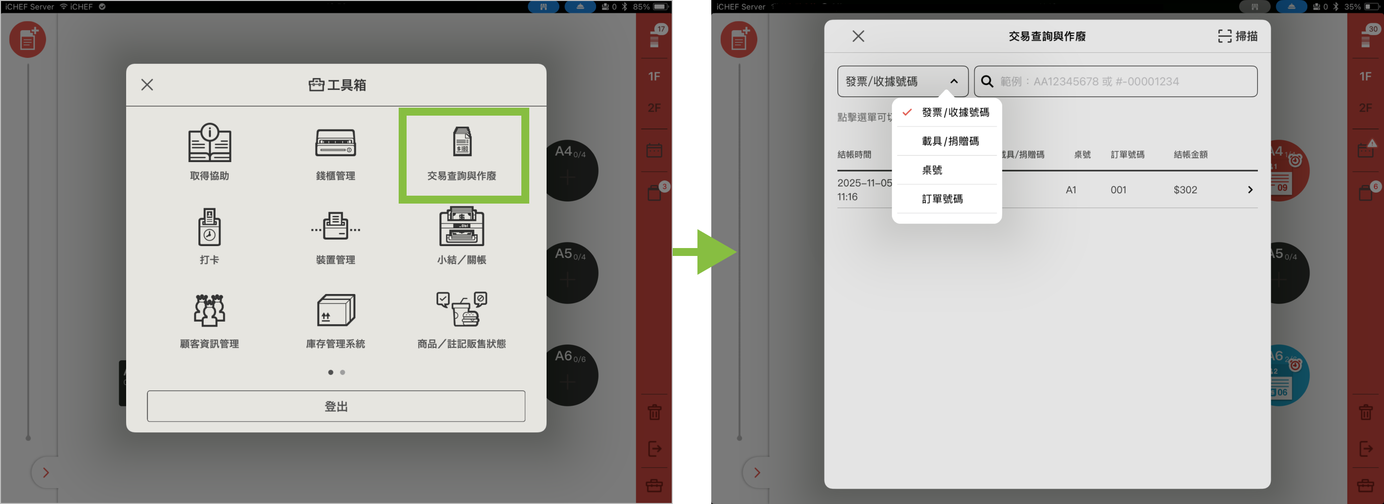 當完成結帳後的交易要查詢或退款時,可透過 iCHEF POS 工具箱中的「交易查詢與作廢」操作。