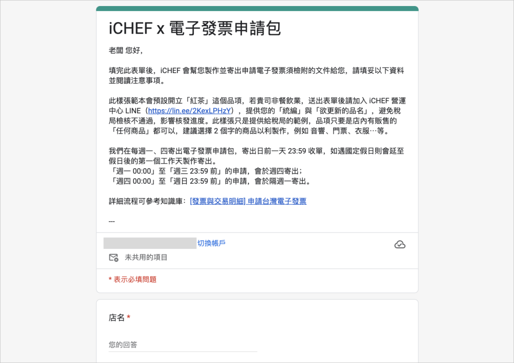 不論是剛開始需要開發票,或是由傳統發票轉為電子發票,你需要先和電子發票平台申請電子發票開立資格,iCHEF 的用戶皆可透過 iCHEF 協助申辦,只要填寫表單取得申請包,填寫完成後送出即可。