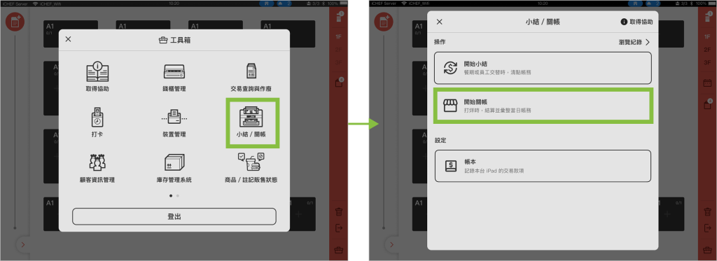 ➤ iCHEF POS App 位置:工具箱 > 小結/關帳 > 開始關帳
