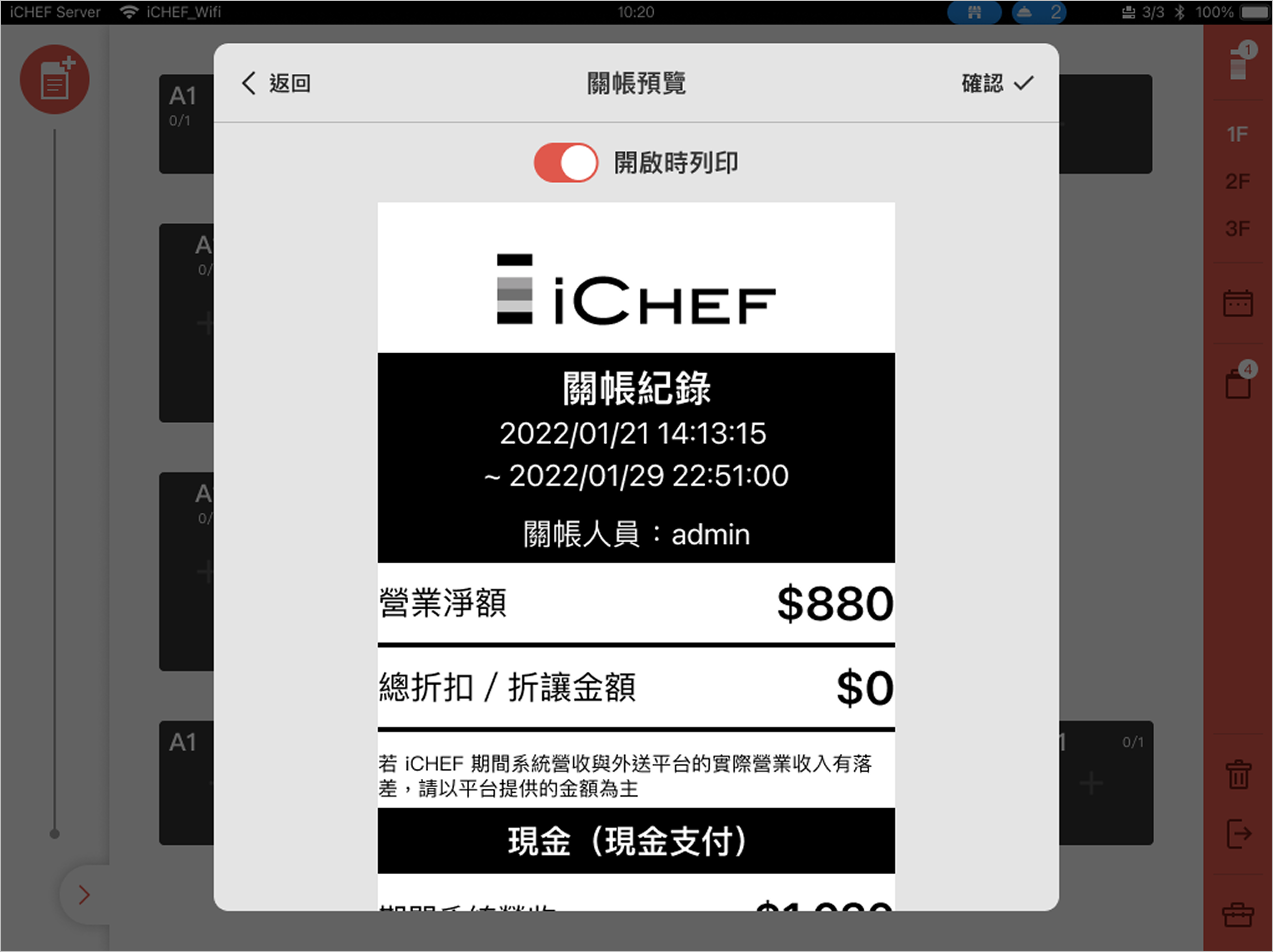 你可自行決定是否列印關帳紀錄。若需列印,請先開啟「開啟時列印」,再點選「確認」。