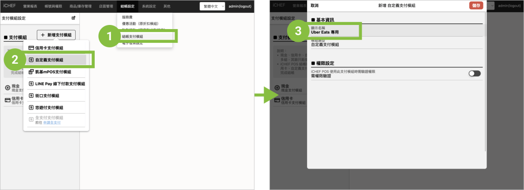 Uber Eats 訂單進入到 iCHEF POS 時皆為「已結帳訂單」,為了讓你在對帳時有清楚的依據,請先建立專用的「結帳支付模組」讓 Uber Eats 訂單金額可以歸帳。