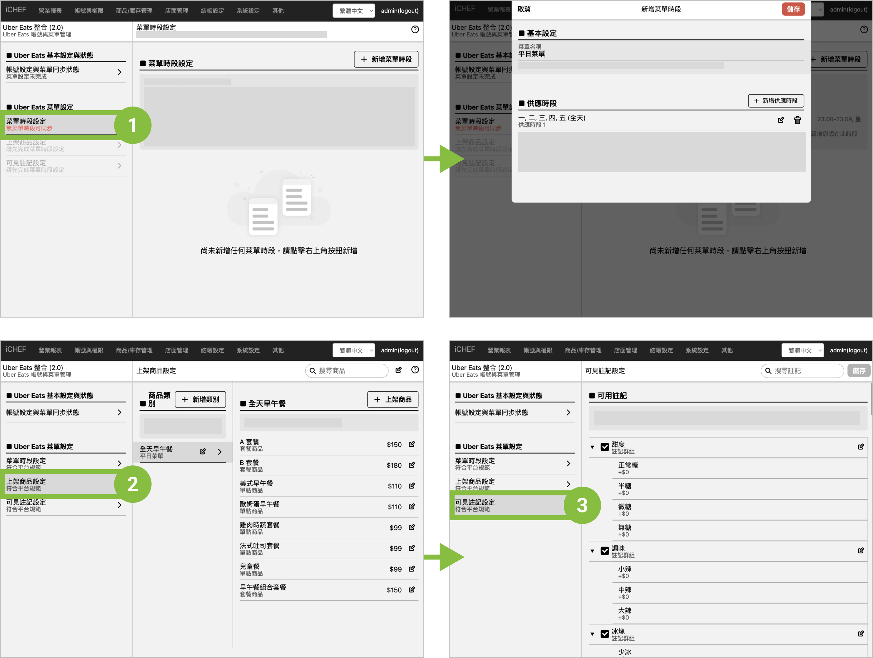 整合後,Uber Eats 菜單將以 iCHEF 後台設定為主,請於「Uber Eats 菜單設定」依序完成: