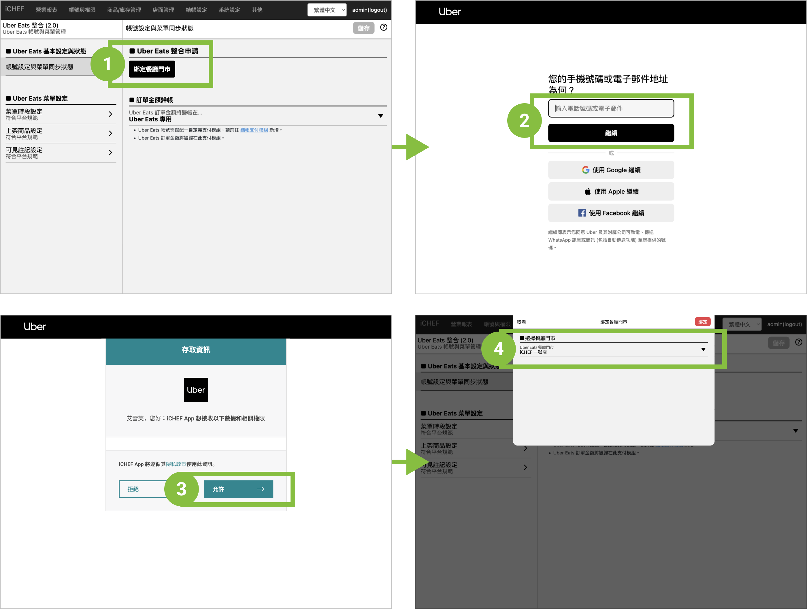 要將你的 Uber Eats 商家和 iCHEF POS 整合,只要進入 iCHEF 後台依照以下步驟申請,設定完成就立即開通!開通後,你就可以透過 iCHEF 一起管理 Uber Eats 菜單與訂單。