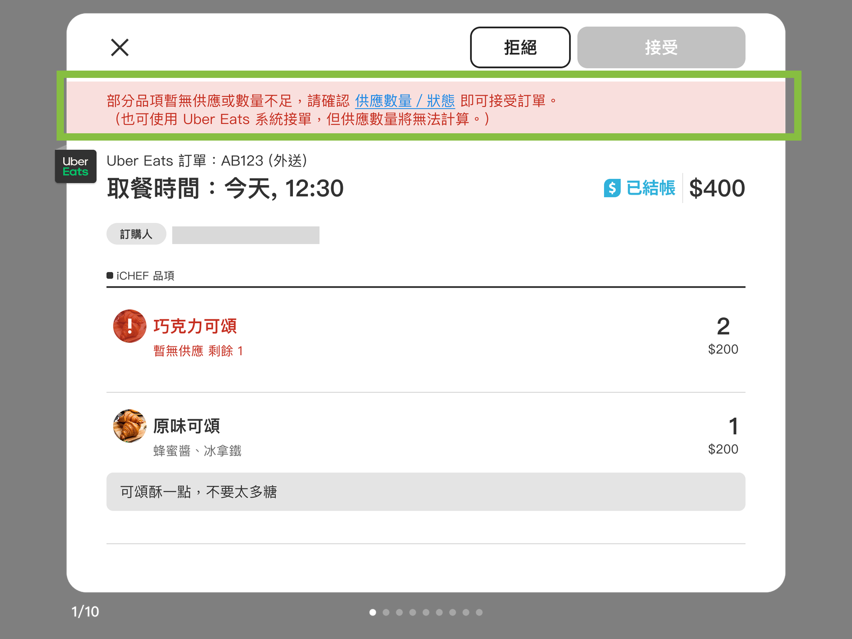 - 數量確認不足以供應:拒絕訂單,或與消費者聯繫重新點餐。