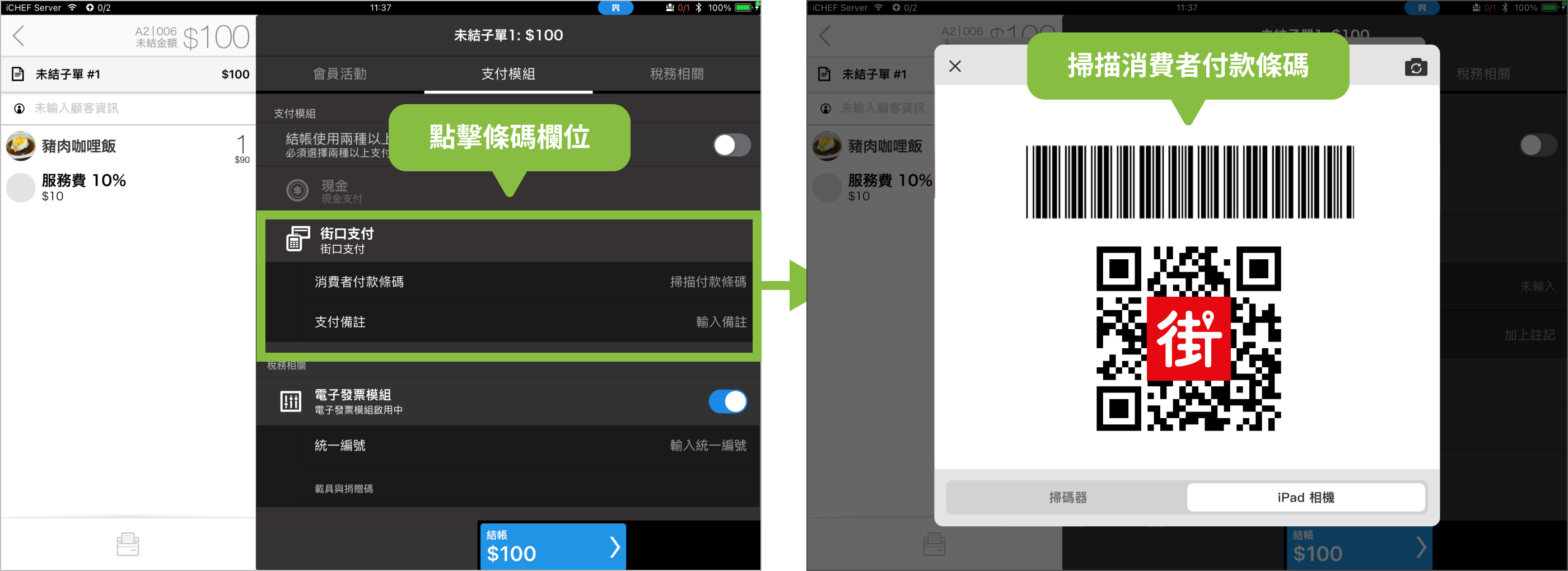 預設使用 iPad 相機即可掃描,店家可自由選配掃碼器,讓結帳流程更快速。
