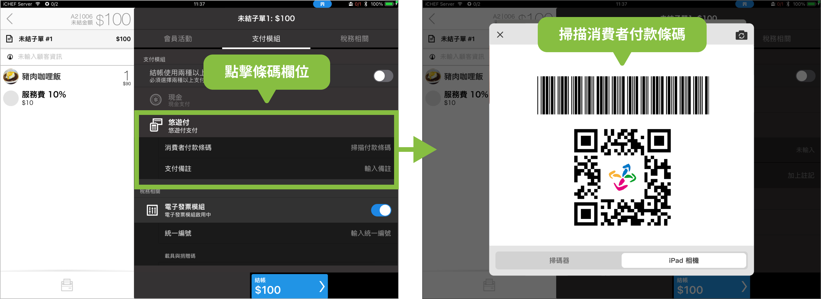 預設使用 iPad 相機即可掃描,店家可自由選配掃碼器,讓結帳流程更快速。