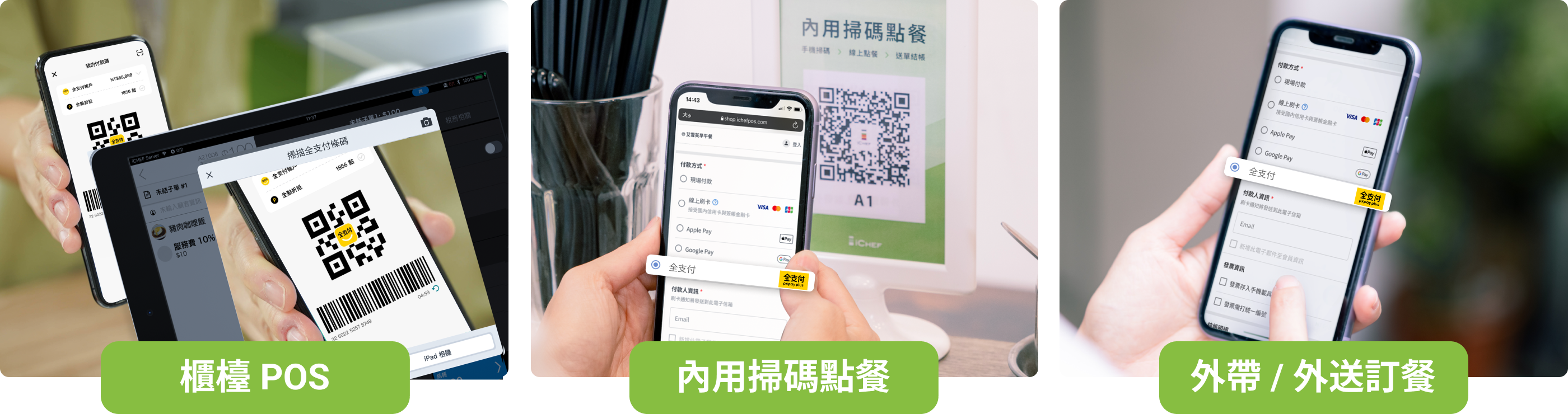 現在!透過 iCHEF POS 整合全支付付款,即可輕鬆應用於櫃檯 POS、內用掃碼點餐,以及外帶/外送訂餐,為你的店家提供更多便利與收益!