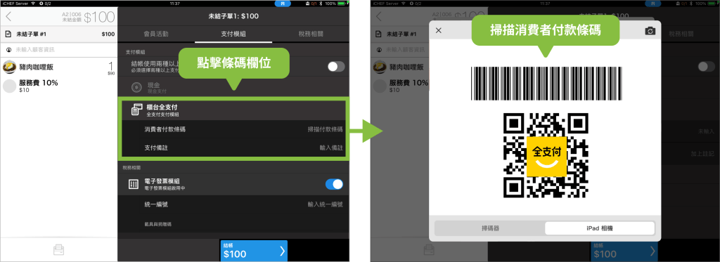使用店內的 iCHEF POS App 結帳時,無需手動輸入金額!只需選擇「全支付支付模組」,點擊付款條碼欄位,即可連動 iPad 掃描消費者的全支付付款條碼,輕鬆完成結帳。