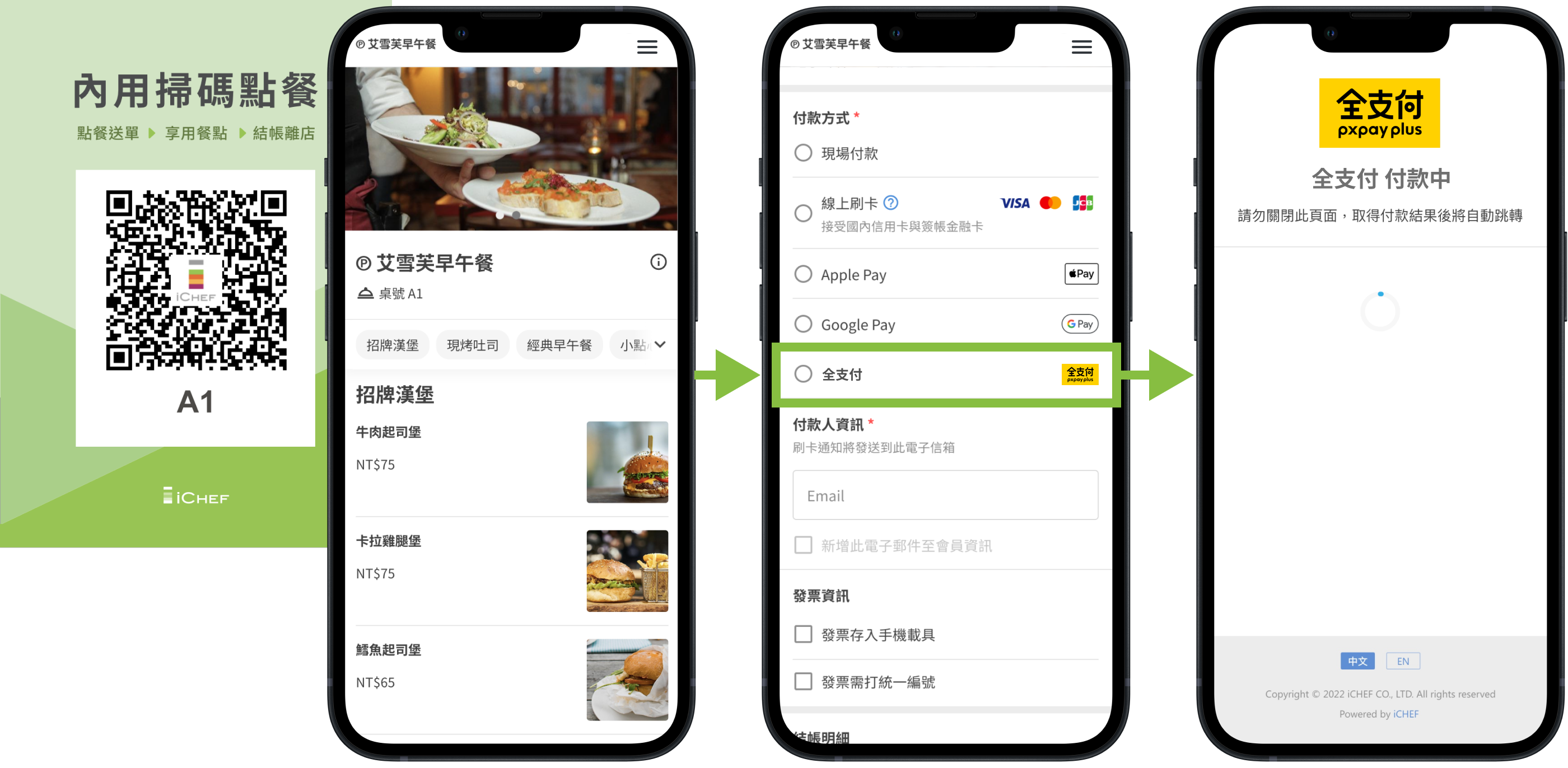 | 內用掃碼點餐 | 消費者於線上點餐後,選擇全支付付款。 |