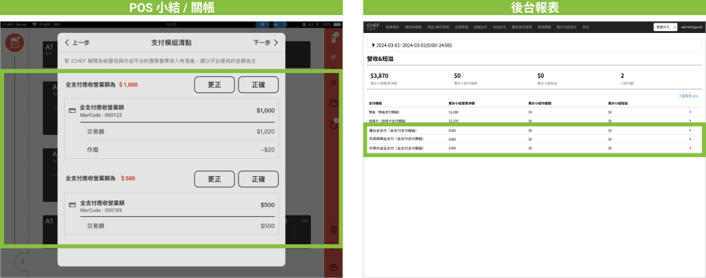 無論是每日小結、關帳,還是查看後台報表,iCHEF 為全支付設置專屬區塊,幫助你快速掌握交易額,輕鬆完成對帳。