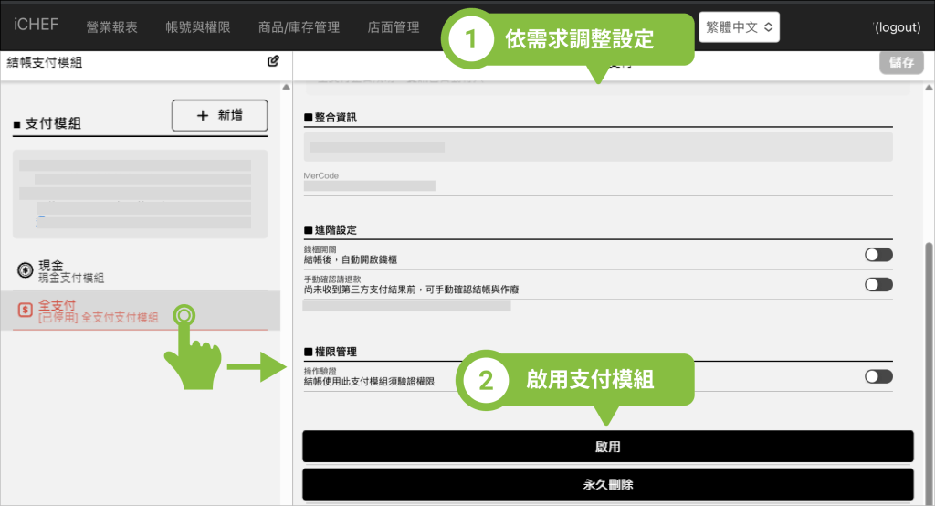 設定有權限的員工才可以使用此支付模組,此設定將會同步至帳號與權限。了解更多