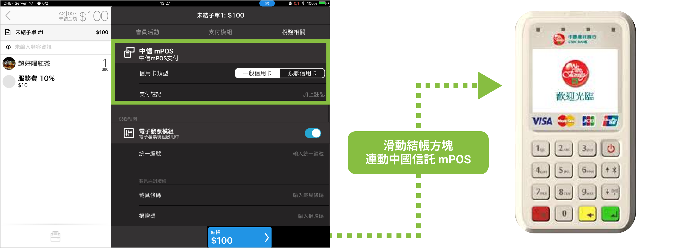 中國信託 mPOS 設備設定完成後,請繼續設定支付模組,此文章將會說明設定的方式與如何在 iCHEF POS 上使用中國信託 mPOS 結帳。