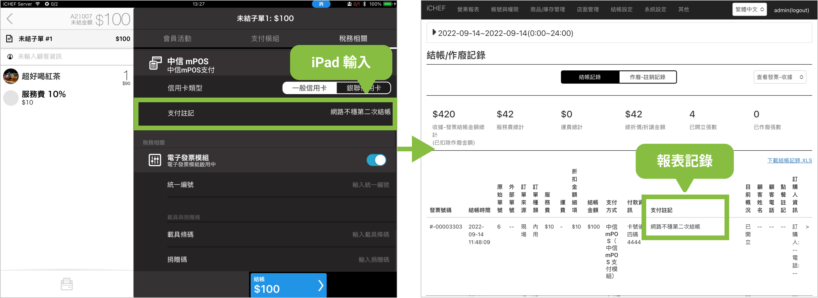 完成支付模組設定與藍牙連線後,中國信託 mPOS 支付選項會顯示在結帳頁中,有特別要紀錄的資訊時,可填寫在支付註記,未來要查詢註記資料時,請至 營業報表 > 結帳/作廢紀錄 查詢「支付註記」欄位。