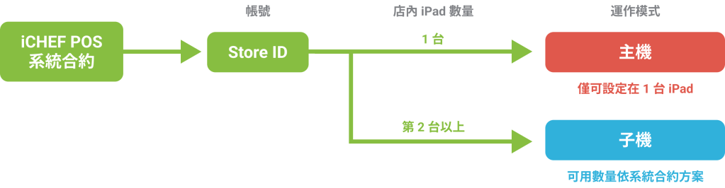 使用 iCHEF POS App 可透過「主機」或「子機」運作模式登入。每個 iCHEF Store ID 僅可設定 1 台「iPad 主機」,當店內需要多台 iPad 進行點餐時,則可透過「子機」運作模式加入,讓所有營運資料同步。
