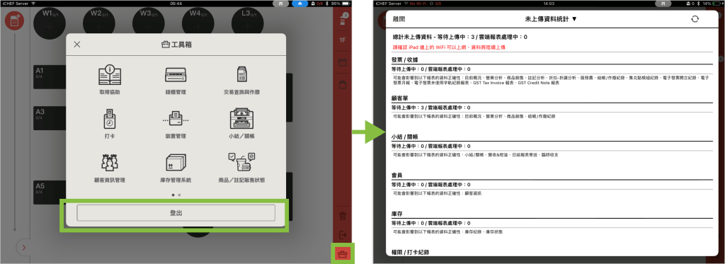 - 使用離線模式時,所有營業資料將暫存在 iPad 上傳器中(顯示於 App 左上),請勿將 App 刪除。
