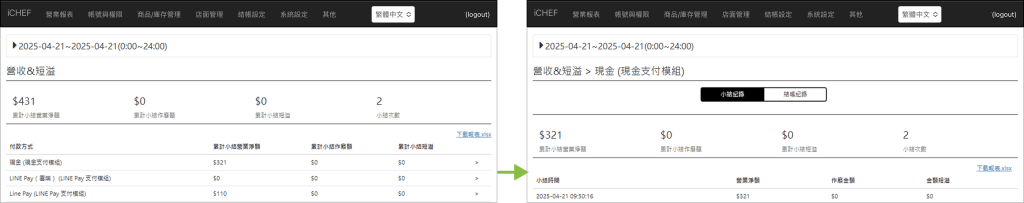 - 欄位說明:系統計算應有金額與實際小結清點金額的差異
