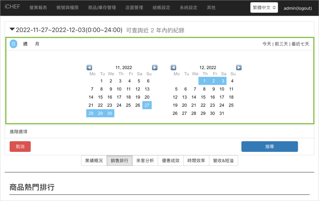 可切換為日、週、月三種篩選單位。為避免久候,建議選取範圍小於 93 天。