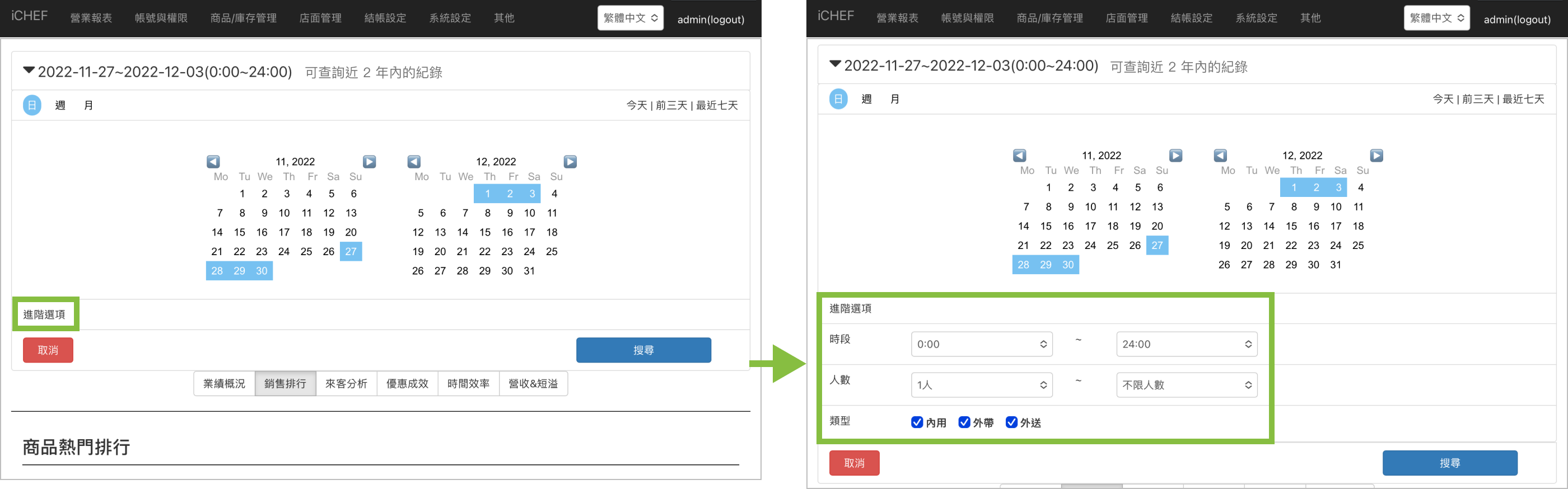 除了上述的時間篩選外,還可以額外篩選特定時段、人數與訂單類型的條件。