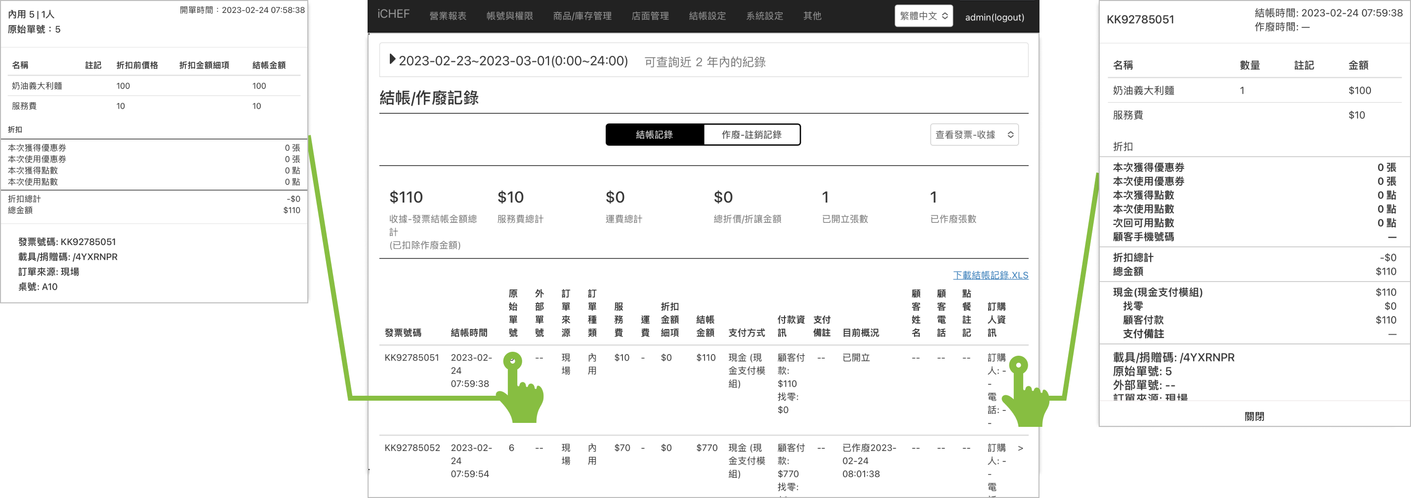 每筆從 iCHEF POS 的訂單在結帳後,資料皆會彙整至結帳作廢紀錄,因此結帳作廢紀錄將有最完整的訂單資料與細節。