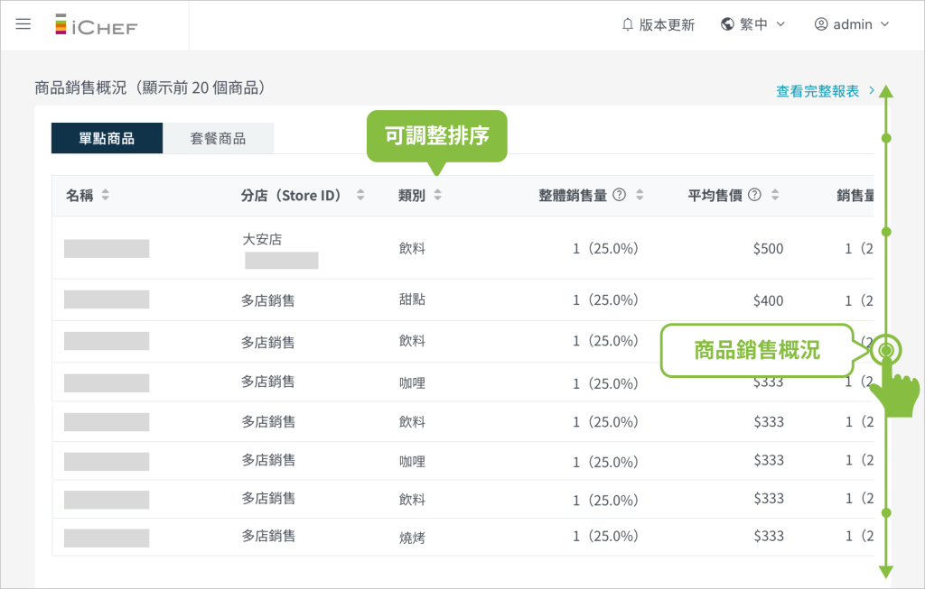 「商品銷售概況」表格一次顯示數量限制為 20 項,可上下滑動檢視。點擊欄位旁邊的上下三角形符號,也能調整檢視內容由多至少或少至多。