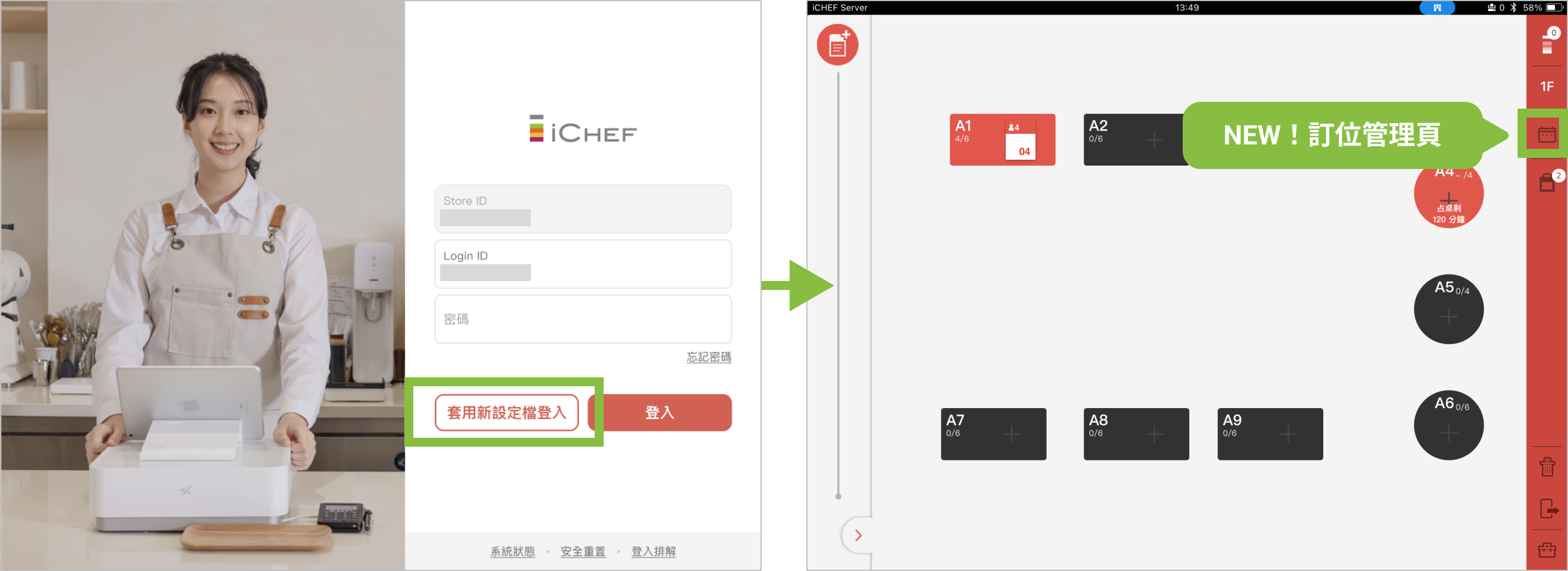 完成後台開通設定了嗎?只要將店內 iCHEF POS App「套用新設定檔後登入」,就能開始使用訂位功能取代你的訂位本囉!