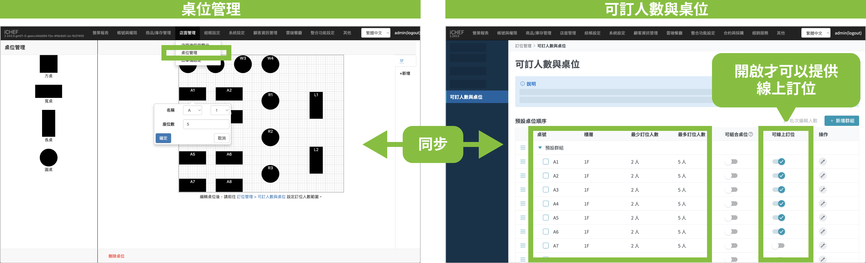 ➤ 後台位置:雲端餐廳 > 訂位管理 > 可訂人數與桌位