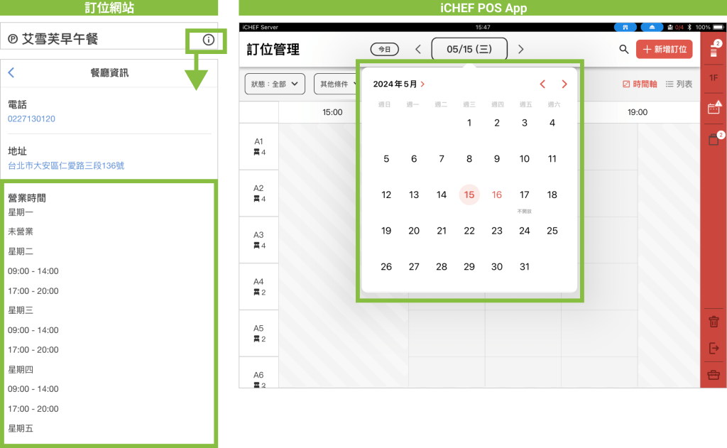 讓你的店家營業資訊,顯示在訂位網站供消費者查看。只要在後台設定儲存後,就會即時更新到你的訂位網站「首頁」、「餐廳資訊」、「訂位資訊」,確保消費者訂對店。
