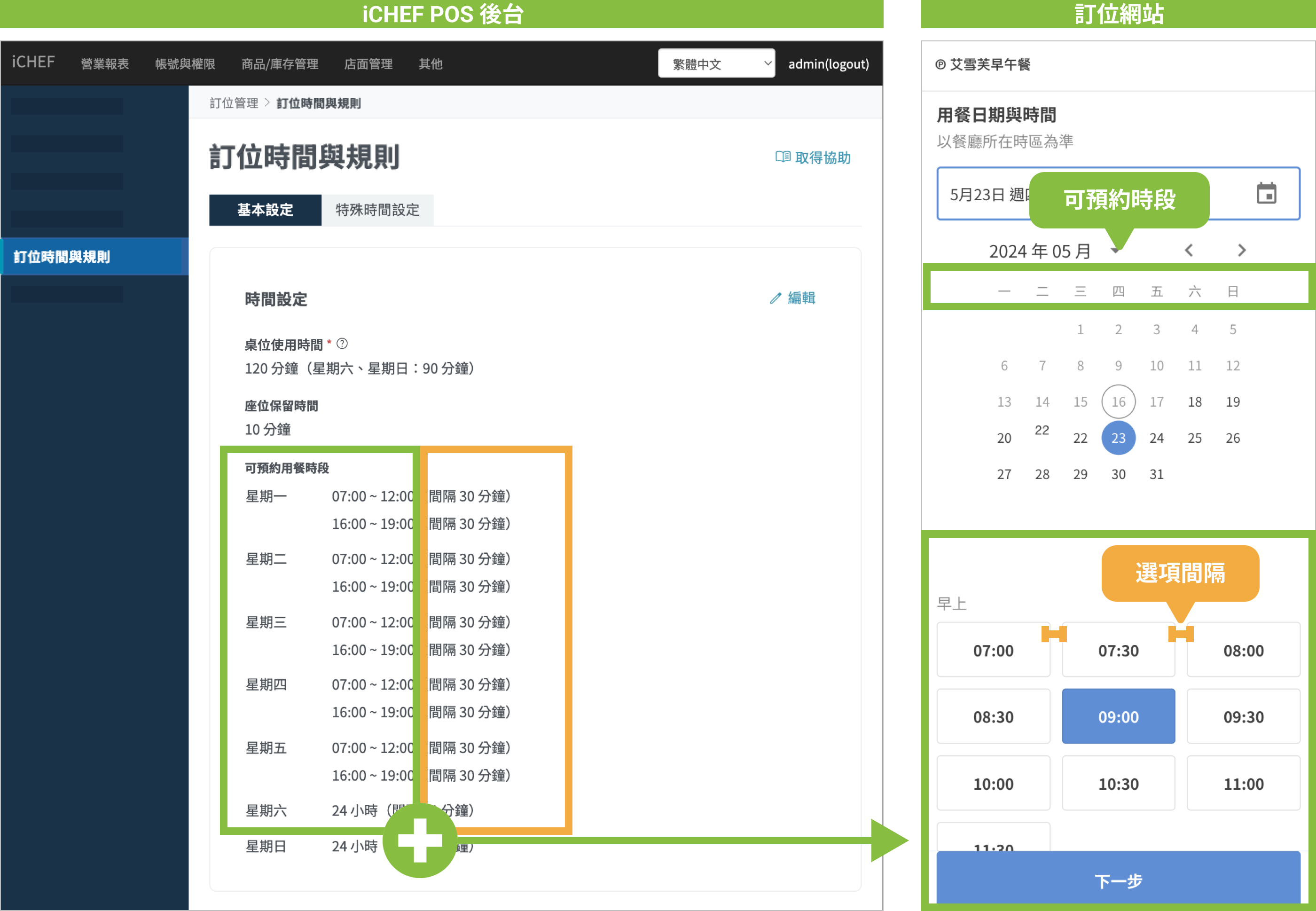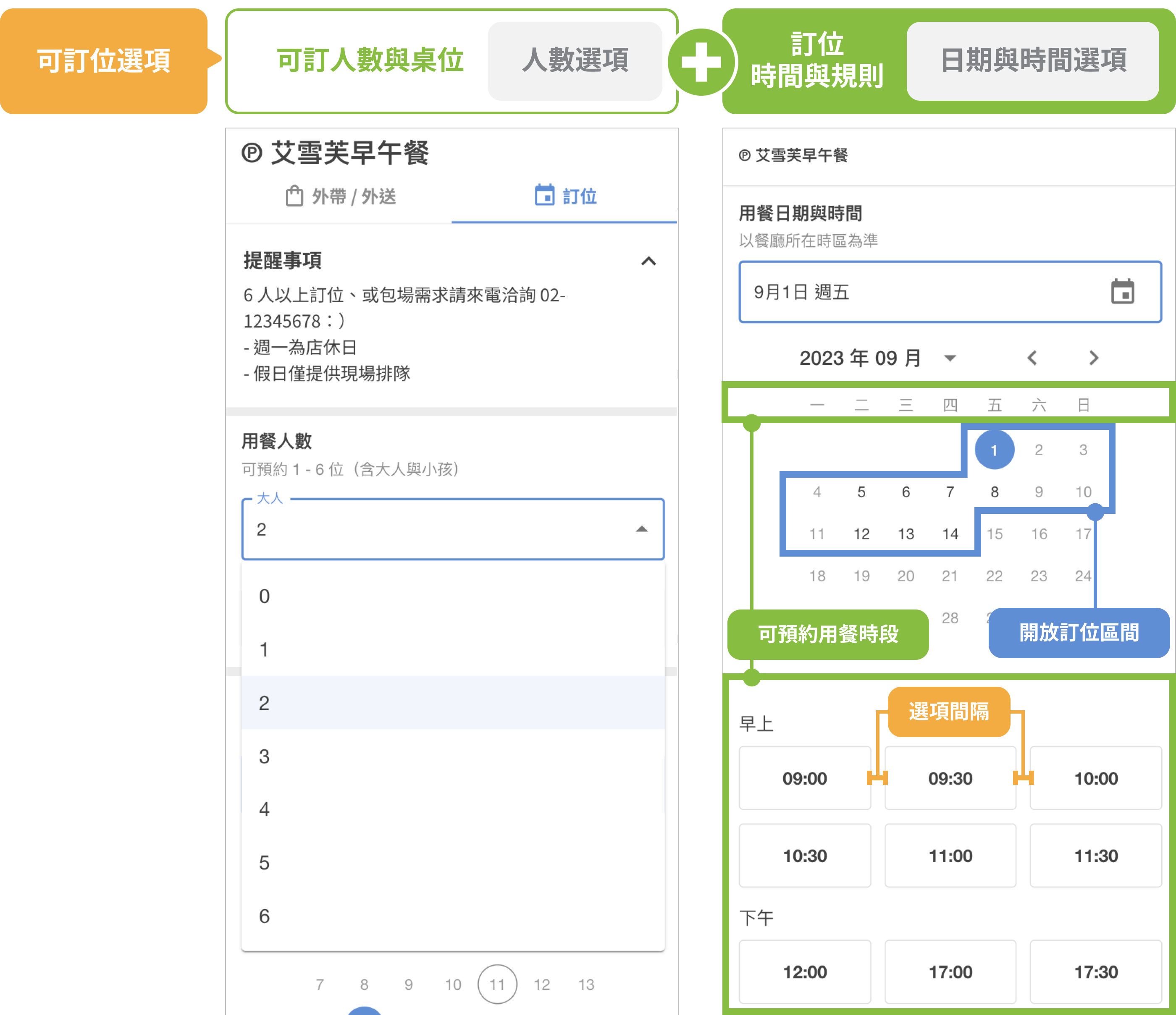 • 可預約用餐時段:時間設定中的「可預約用餐時段」+「選項間隔」,將會組成訂位網站中的「用餐時間」選項。
