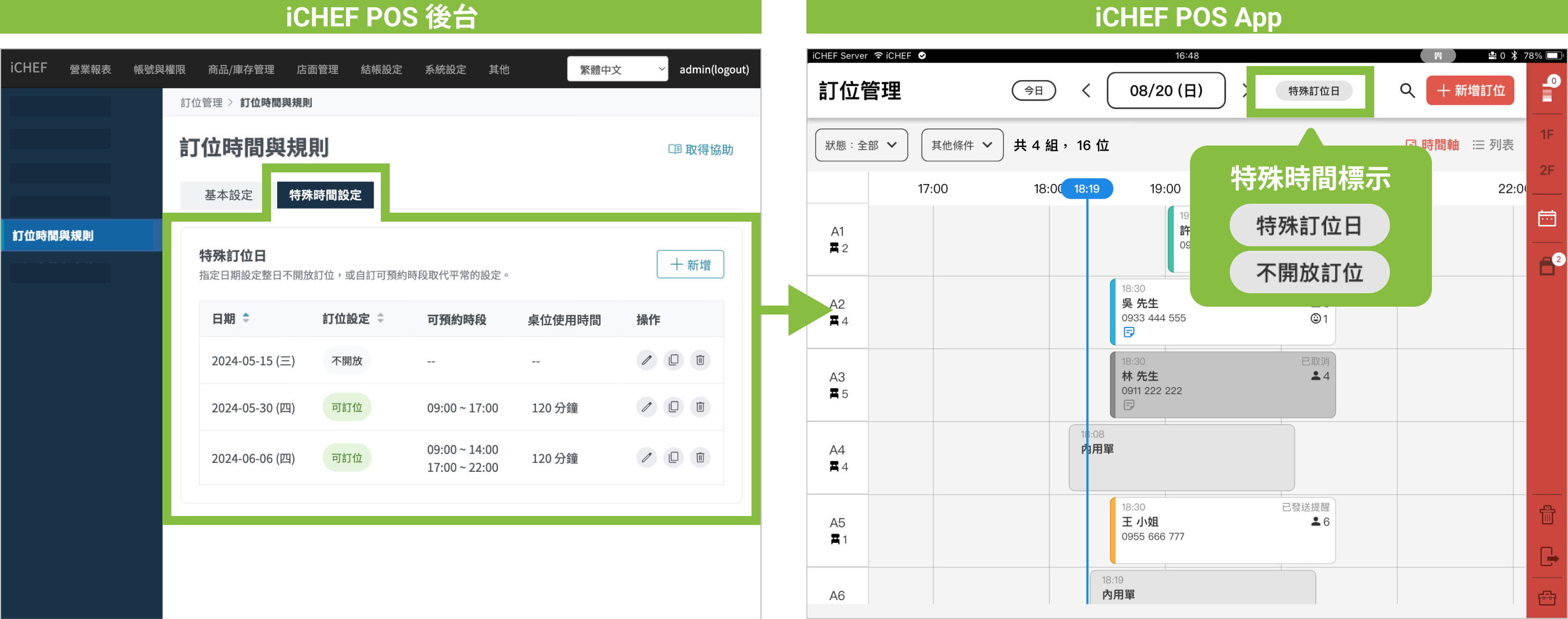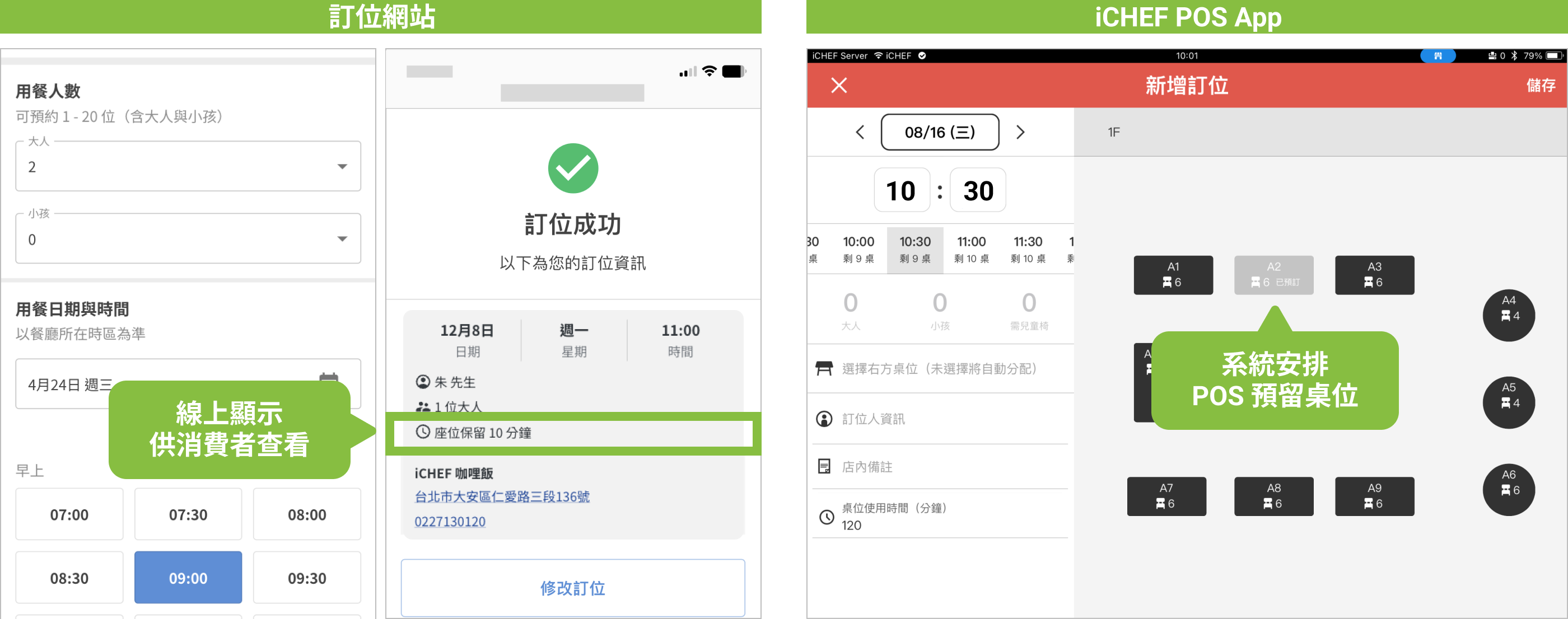不論是現場 POS 訂位、線上訂位網站,系統都會同步更新與標示。