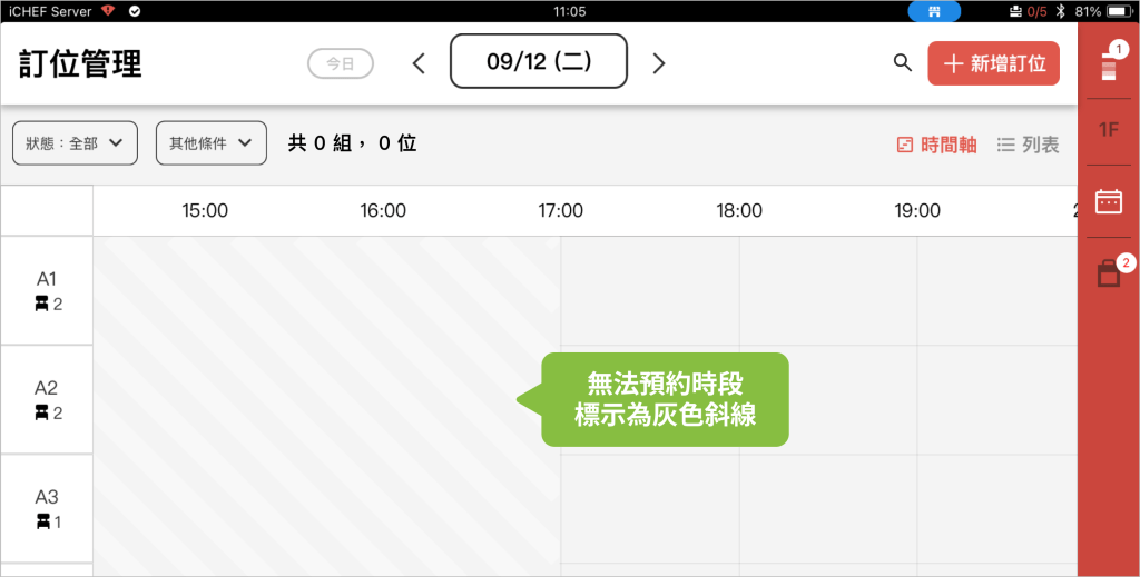 而 iCHEF POS App 中也會將所有「非預約用餐時段」,標示為灰色斜線。