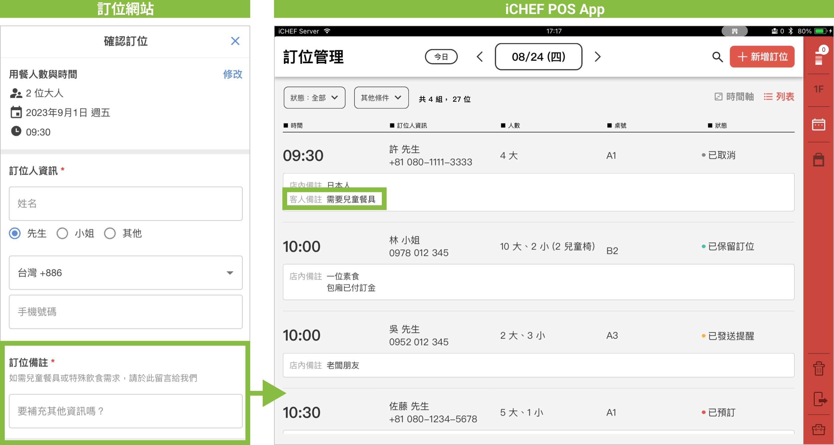 • 訂位備註:顯示在線上訂位的最後一步,讓消費者在訂位時就能先提供額外須先告知的事項,例如:需要兒童椅、有素食者等等資訊。