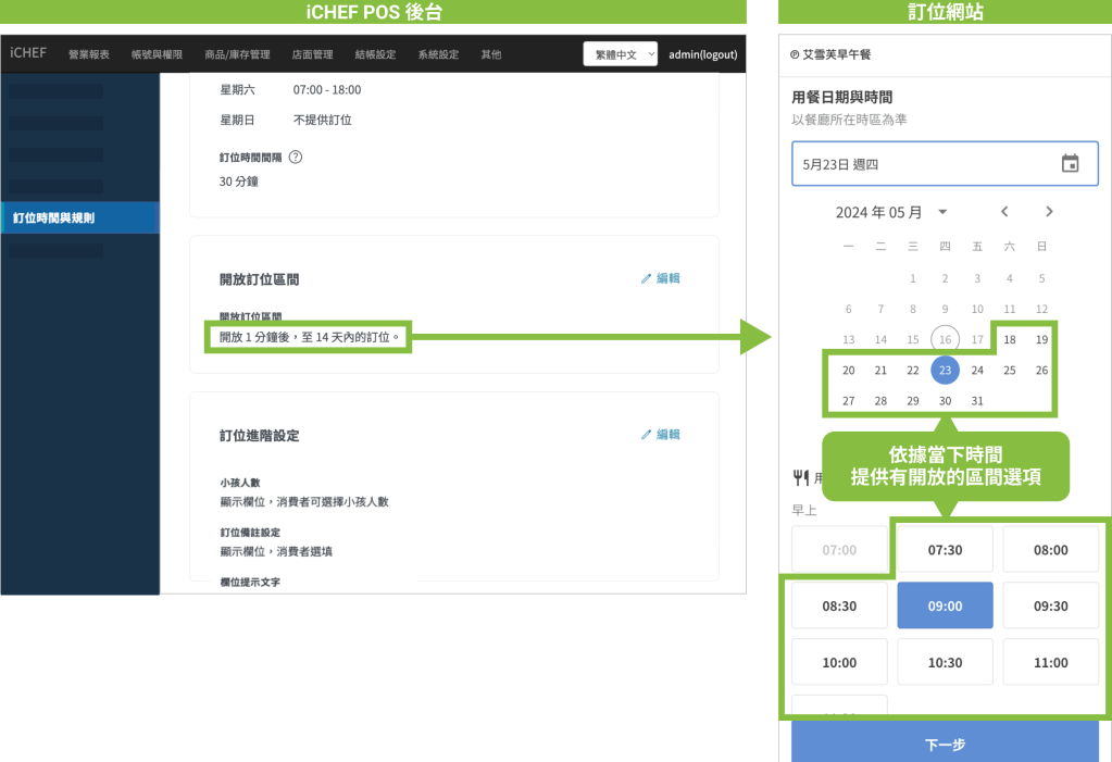 使用線上訂位,要讓消費者自己也能「訂對時間」、「訂對人數」,只要將 iCHEF 後台的「可訂人數與桌位」和「訂位時間與規則」設定好,系統就會照你的規則,開放選項給消費者。