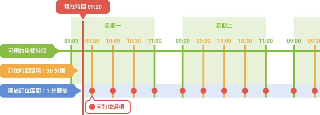 • 最早:當天 1 分鐘後的下一個「訂位時間」09:30。