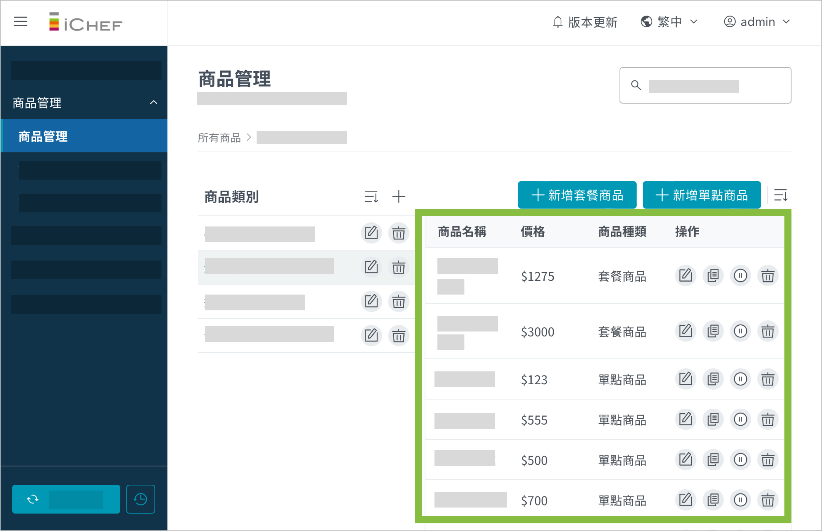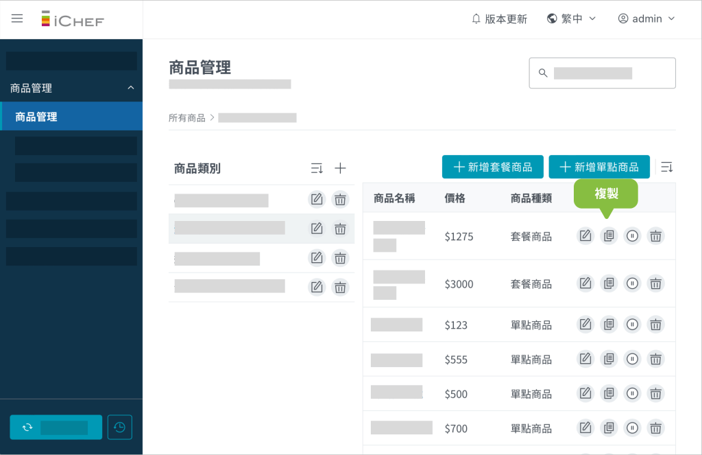 - 步驟 1:選擇操作項目,點擊「新增單點商品」、「新增套餐商品」按鈕或「編輯」圖示。