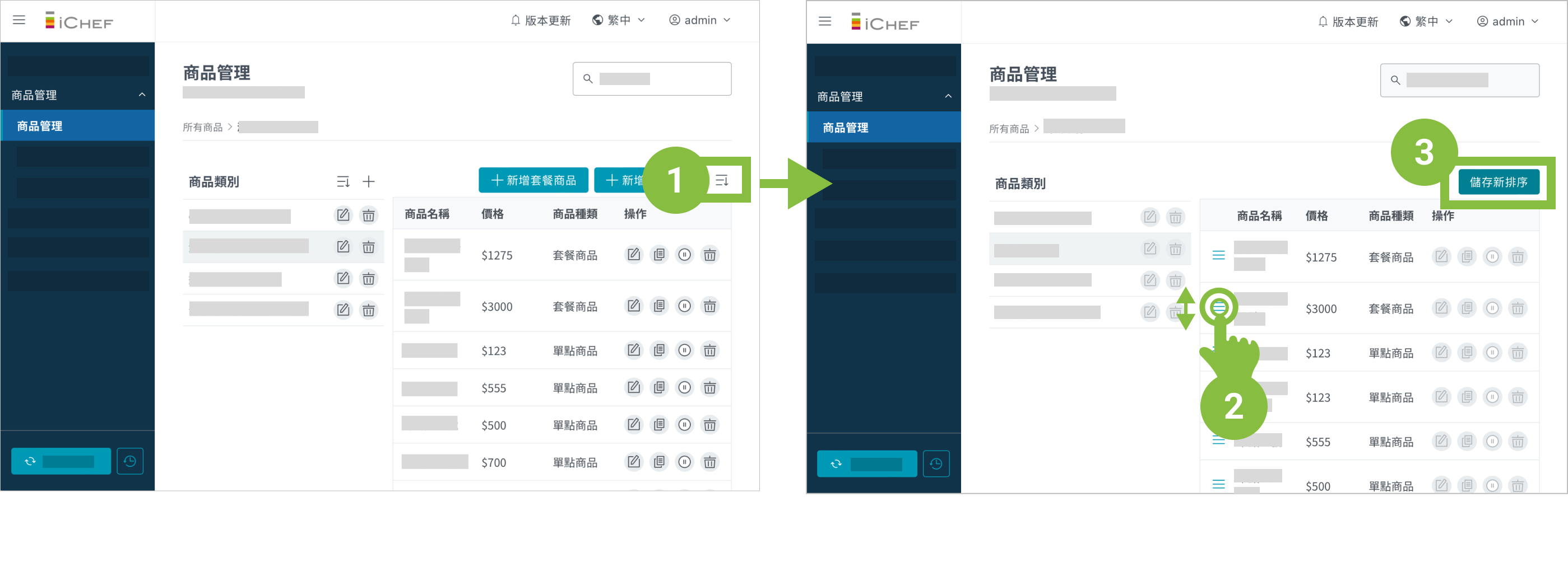 商品在後台的排序,將等於現場出單的順序,例如希望先印套餐,再印單點,你就需要將套餐的排序往前移。