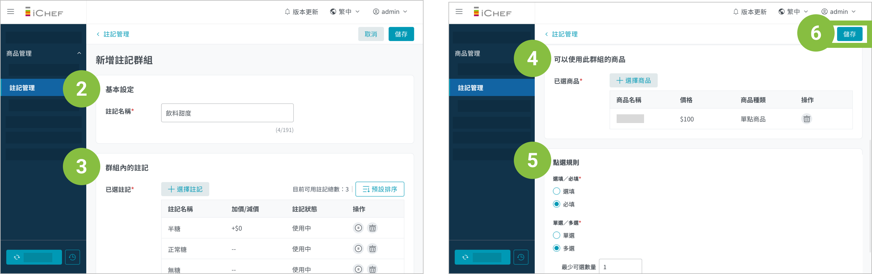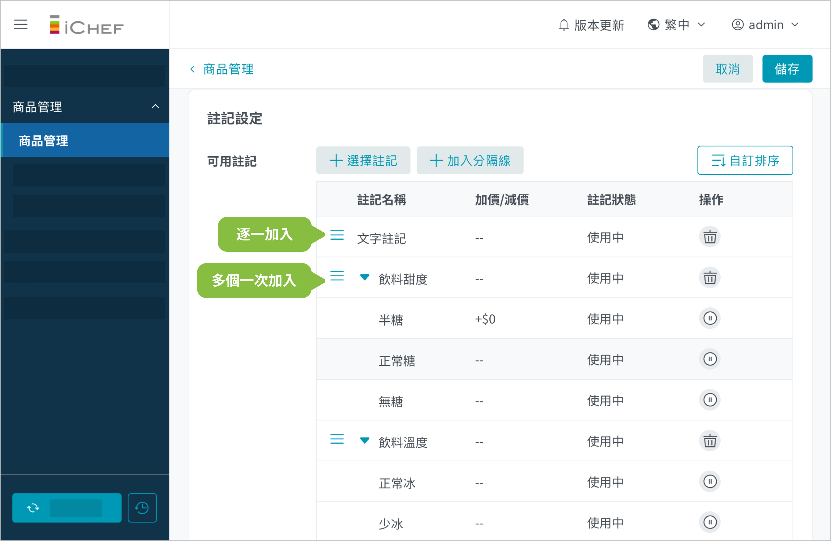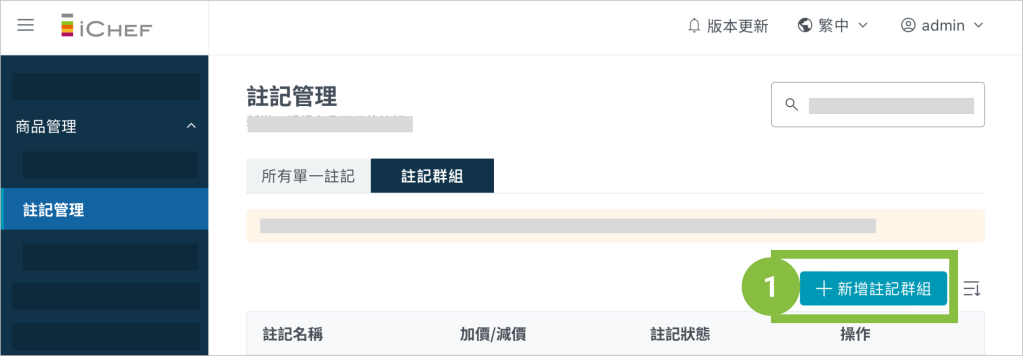 ➤ 總部後台位置:左側功能列 > 商品管理 > 註記管理「註記群組」