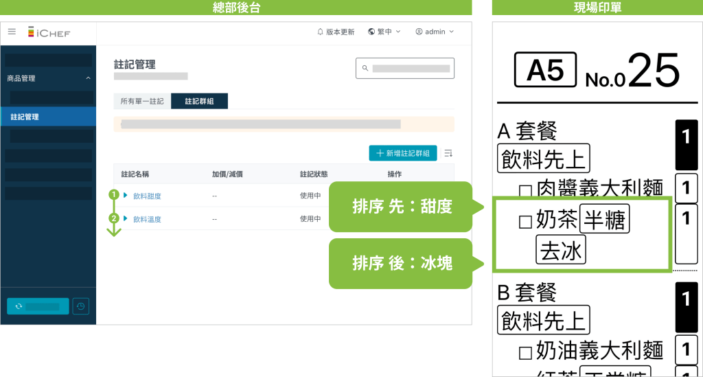 在後台的排序,將影響點餐和現場出單的順序,例如希望預設排序是先甜度,再冰塊,就要將甜度的排序往前。