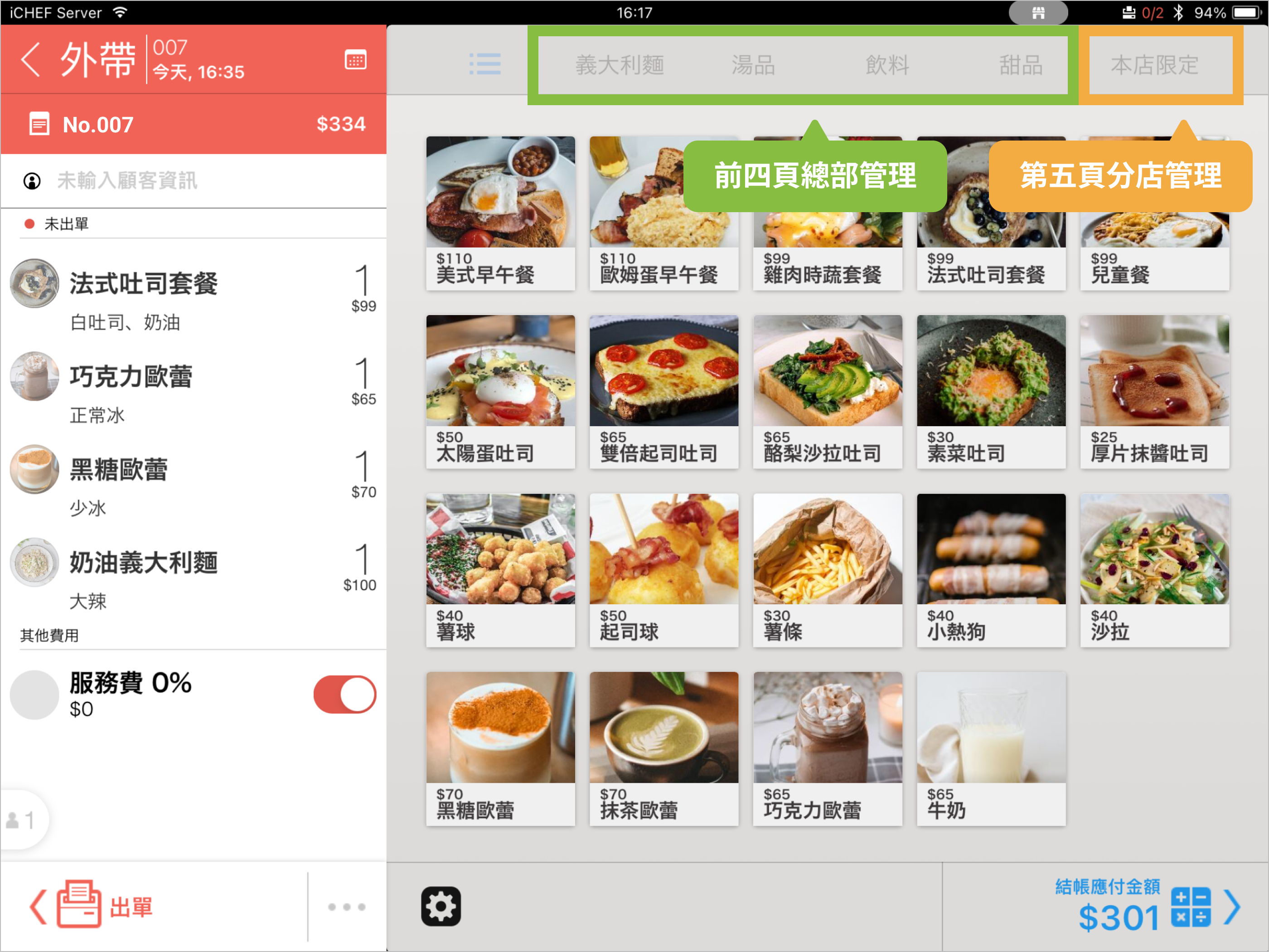 iCHEF POS 的菜單頁共有五頁,前四頁皆為總部可同步的範圍,第五頁則是保留給分店的專屬頁面。