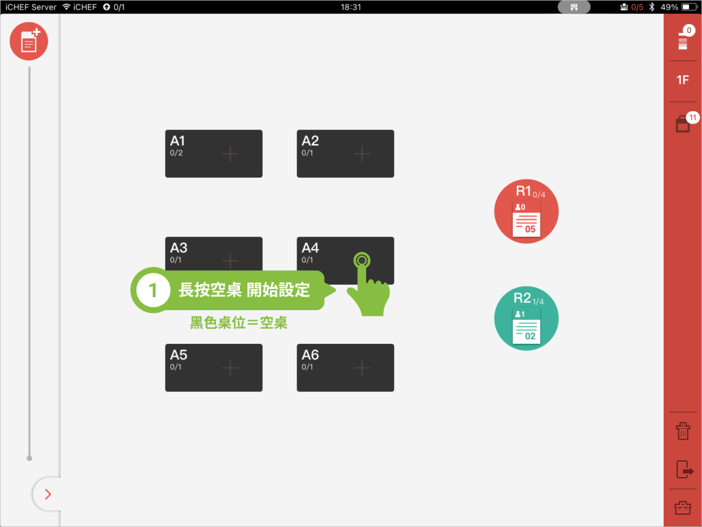在 iCHEF POS 的內用區可以管理店內目前桌位狀況,黑色桌位表示為空桌,當有指定桌位要保留時,只要長按桌位上的「+」,就可以開始設定。