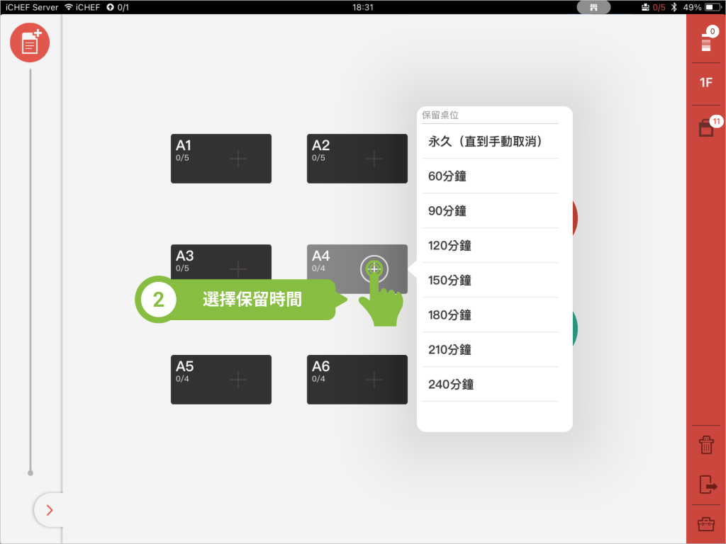 營運中若需將特定桌位保留使用,只要長按桌位、選擇時間,就能立即標示「保留桌位」並自動倒數!讓員工帶位時容易辨識,不用擔心超收客人。