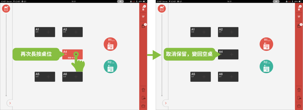 而前台人員也可以隨時透過「手動」的方式,中途取消保留。操作方式很簡單,只要再次長按桌位即可取消,釋出的桌位將變回黑色空桌顯示。