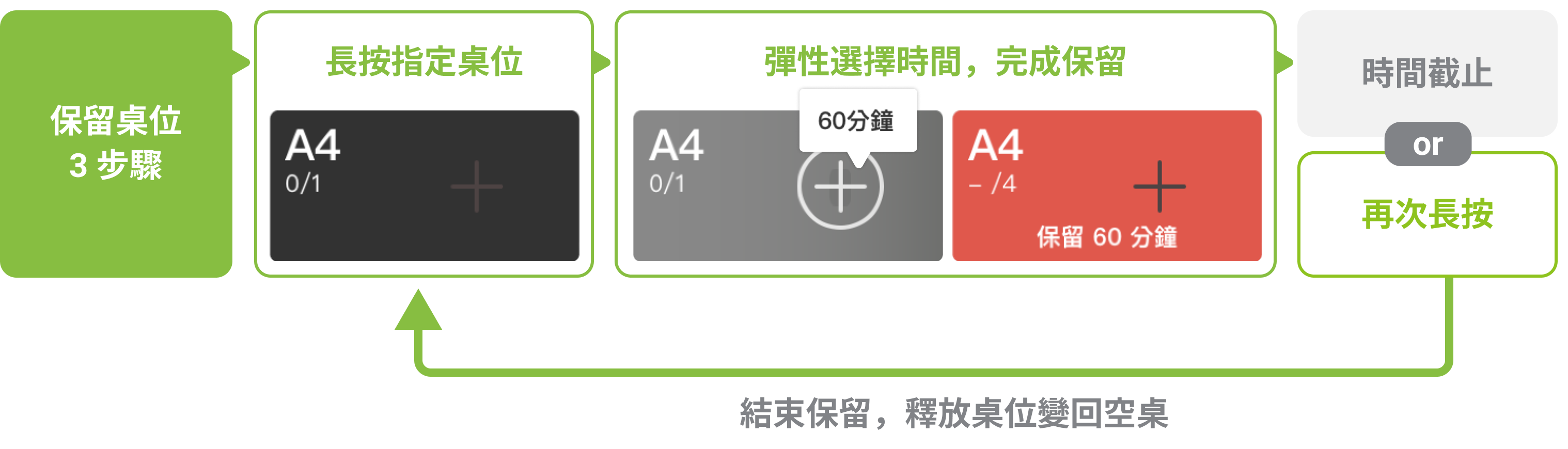 有指定時間的保留桌位,系統將於時間截止時「自動」釋出桌位。