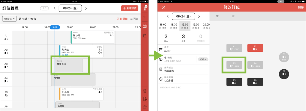 有使用訂位管理的店家也不用擔心,保留桌位會同步顯示在訂位管理頁面的「時間軸模式」,且進到新增或編輯「訂位資訊」時,也能看到桌位顯示為「使用中」,讓你能更好掌握所有桌位的使用狀況。