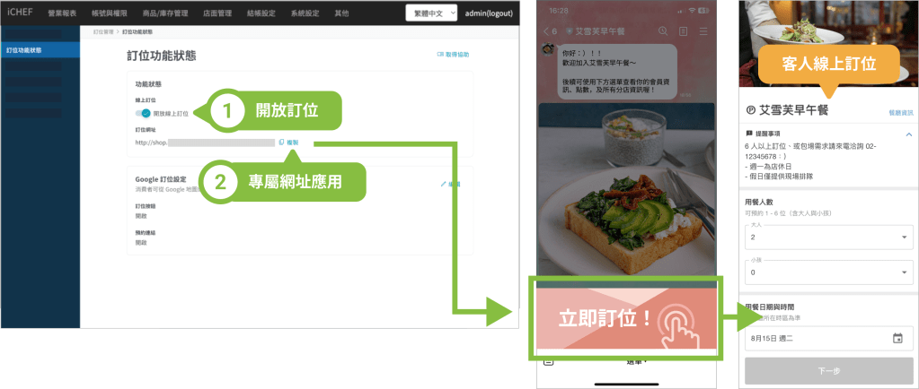 店內訂位電話接不完?想讓客人自己線上訂位嗎?完成後台開通設定後,你將會獲得專屬的訂位網站,進入「訂位功能狀態」設定頁,2 步驟就讓你的客人開始使用線上訂位: