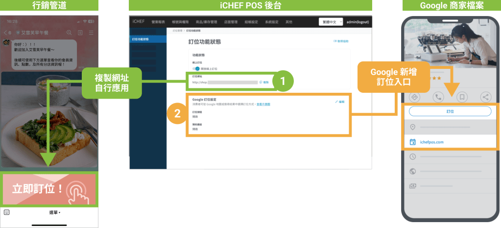 只要你的 iCHEF POS 帳號已經綁定 Google 商家檔案,就能直接在 iCHEF 後台新增 Google 商家檔案中訂位入口!讓消費者在 Google 的地圖或搜尋結果中,就能直接訂位。(了解更多