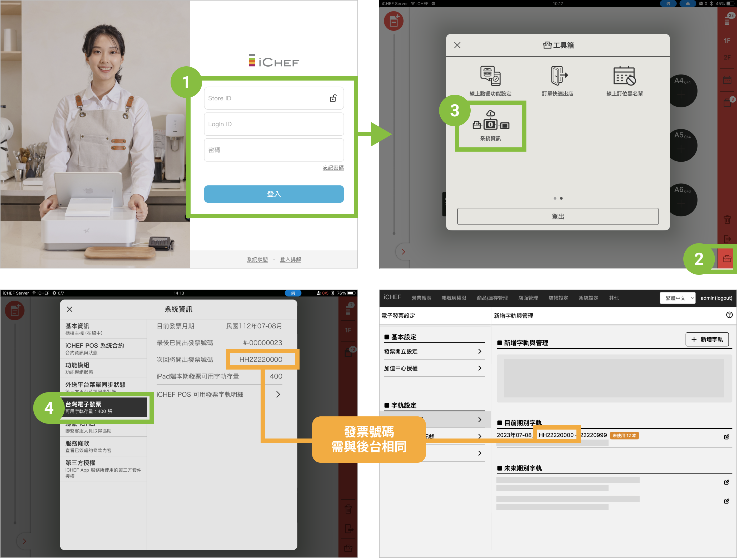 變更 iCHEF POS 電子發票「營業人統一編號(以下簡稱:統編)」共 6 步驟:
