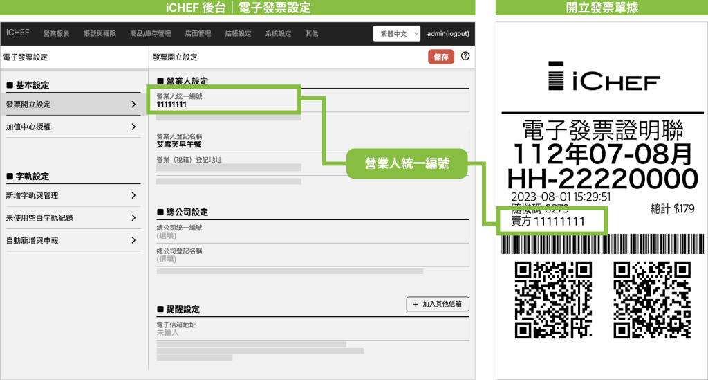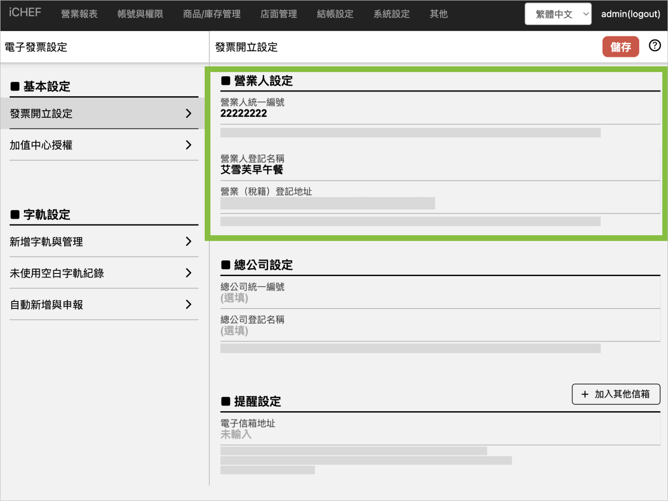 於 iCHEF 後台 結帳設定 > 電子發票設定 變更「營業人統一編號」及相關營業人資料後,按「儲存」完成設定。