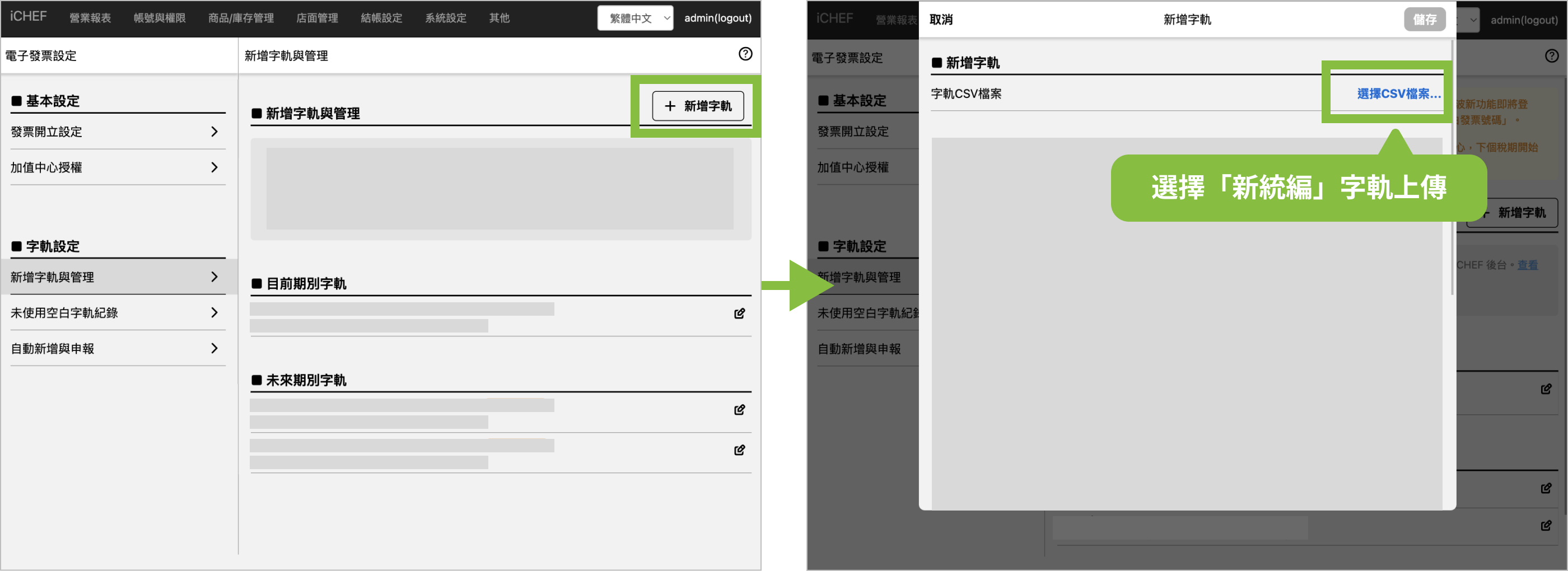 3. 若要繼續使用 iCHEF 後台一站完成「新增字軌」與「上傳未使用空白字軌」功能,請盡快將「新統編」完成 iCHEF 電子發票加值中心授權。