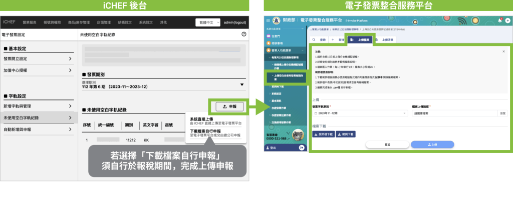 你可於 iCHEF 後台 未使用空白字軌紀錄 申報「舊統編」的未使用紀錄,可選擇「系統直接上傳」或「下載檔案自行申報」再自行上傳至電子發票整合服務平台,完成稅務申報(完整說明請由此查看)。