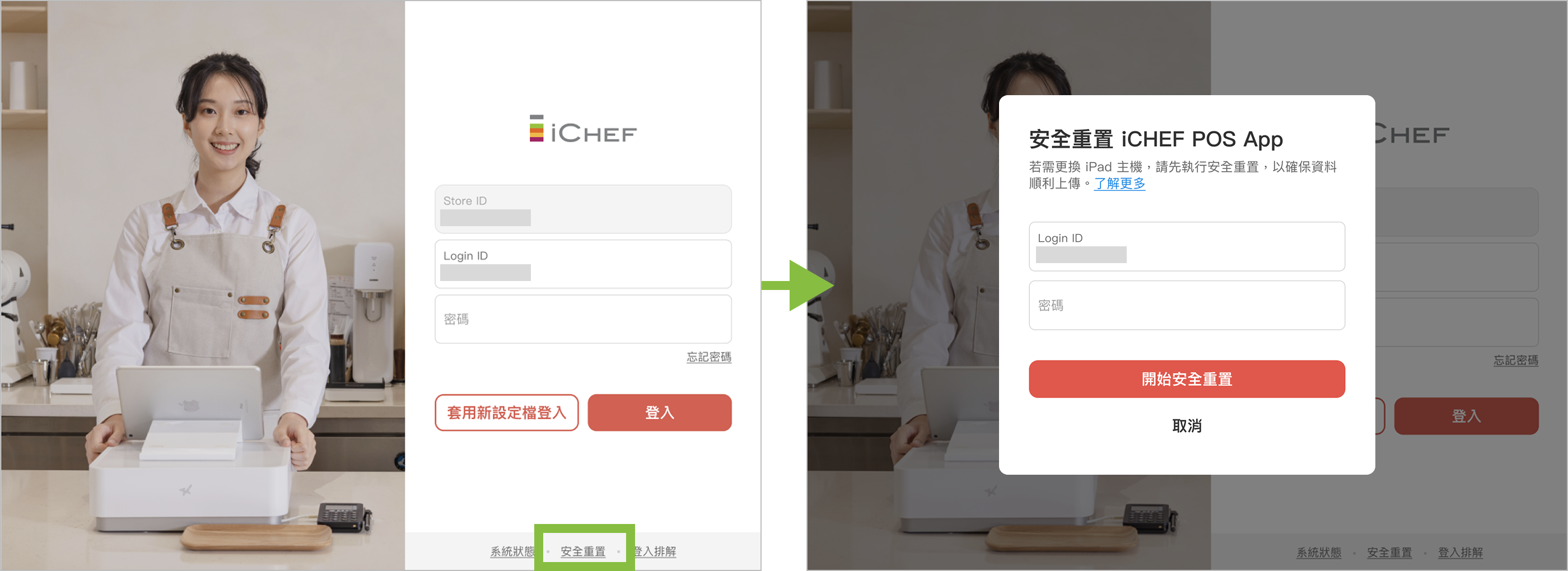 將已登入的 iPad 主機,回到登入頁後,點擊下方的「安全重置」完成操作。